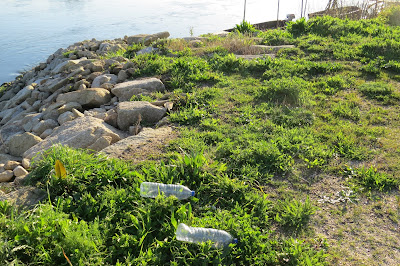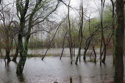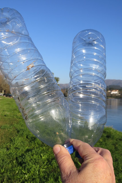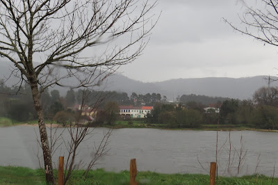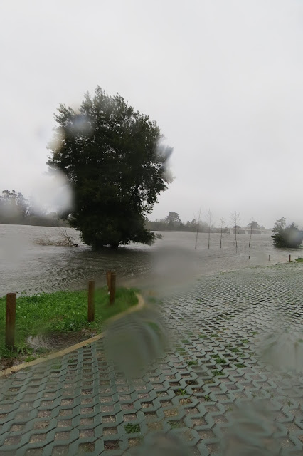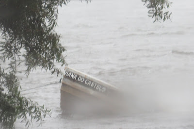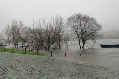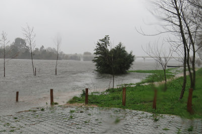 De automóvel pode-se chegar ao rio Lima sem recear ficar sem uma linha enxuta da roupa que veste. Fui lá, depois do almoço (dentro do carro, nem seria preciso escrever, pois detesto tomar banho vestido e sapatos secos, não dá jeito nenhum limpar com a toalha o fato molhado) e, outros mais faziam o mesmo que eu (vão ali ver a massa líquida incontida da corrente nos limites das margens e os troncos que ela arrasta, penso eu e estou certo do que digo). Rio cheio, a transbordar, um barco de proa à vista quase submerso e o Caninhas a devolver ao rio a água que o água-arriba lhe tirou vinda das nuvens. Faz isto todos os dias, o Caninhas, e pagam-lhe zero euros que ele, agora, faz apenas o que quer e gosta de fazer. Registo com a Canon através da janela aberta com os pingos a perturbar a lente, e a mim, o estado em que a chuva deixou os terrenos alagadiços do Parque Verde. Uma garça aproveita e trata de alimentar-se, pouco impressionada com o lençol natural que a chuva criou. É branca, não é águia, disso eu tenho a certeza, essas são vermelhas ou parecem...