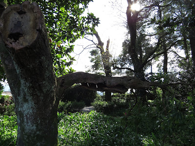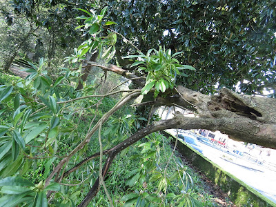 O tronco do rododendro do qual apenas um dos seus braços continua vivo.