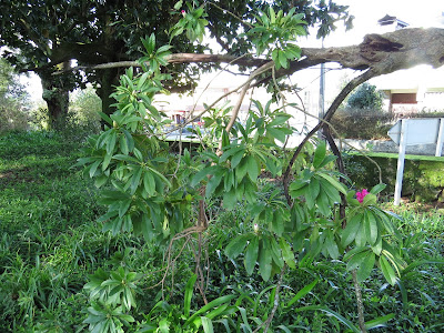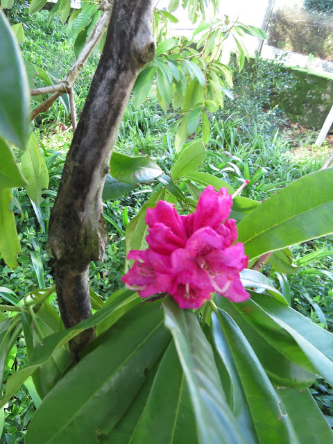 É como se a vida emanasse de um esqueleto humano, é o que se pode concluir do facto de o centenário RODODENDRO existente no jardim da Casa do Paço dos Condes de Almada, em Lanheses (Viana do Castelo), continuar surpreendentemente com a seiva a circular no tronco em decomposição, alimentando um único ramo onde uma flor já abriu e mais cerca de trinta outras em breve irão enfeitar e formar o ramalhete que atesta a sua extraordinária resiliência na luta pela sobrevivência. Amputado de grande parte dos seus ramos, porque inúteis, ergue-se para o alto em forma de "V" o que resta do corpo seco do arbusto feito árvore pelos anos de vida somados e, horizontalmente, carcomido, esburacado e a desfazer-se um braço falsamente inútil porque, de si nasce a tocar o solo, um ramo com folhas verdes carregado de botões em vias de mostrarem as belas flores de aveludado carmim.