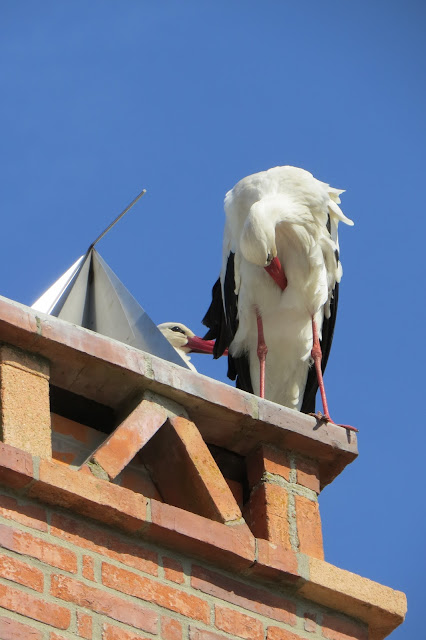 O casal de cegonhas brancas desalojado da chaminé do edifício da antiga casa do povo na Rua de Santa Eulália (Largo Capitão Gaspar de Castro), em Lanheses, Viana do Castelo, onde nidificaram sete anos consecutivos dando à Natureza mais de duas dúzias de aves, dão sinais inequívocos de contestação pelo despejo unilateral que sofreram, insistindo em reocupar o sítio não obstante os dois engenhos metálicos que lá se encontram colocados. Cerca das 13:00 horas de hoje, sábado dia 23, as aves abandonaram, talvez temporariamente, o cimo da palmeira onde ultimamente eram avistadas com bastante assiduidade dando, a entender que ali iriam permanecer para nidificar, regressaram ao anterior pouso como que numa ação deliberada de afirmação de direitos adquiridos e ali estiveram por tempo considerável a tratar de higiene pessoal e assinalando ruidosamente com o bater sonoro dos bicos a sua presença.